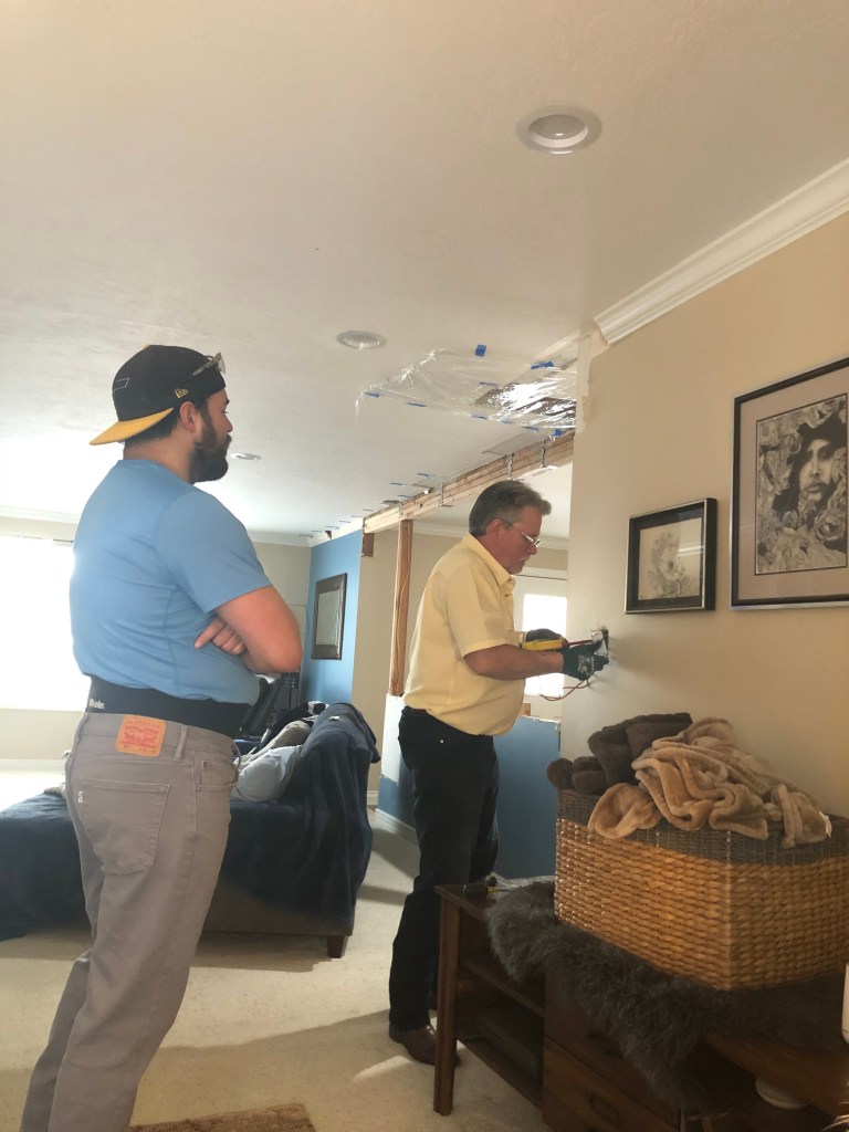 – Sheldon installed the light housing cans all at once in the attack because he didn’t want to go in and out. It only took us cutting one hole to determine that we wanted to use the Hole Saw to achieve a perfect cut every time. While Sheldon drilled the holes in the ceiling, I held a 5 gallon bucket as close to the ceiling as possible to catch debris and help contain the dust.