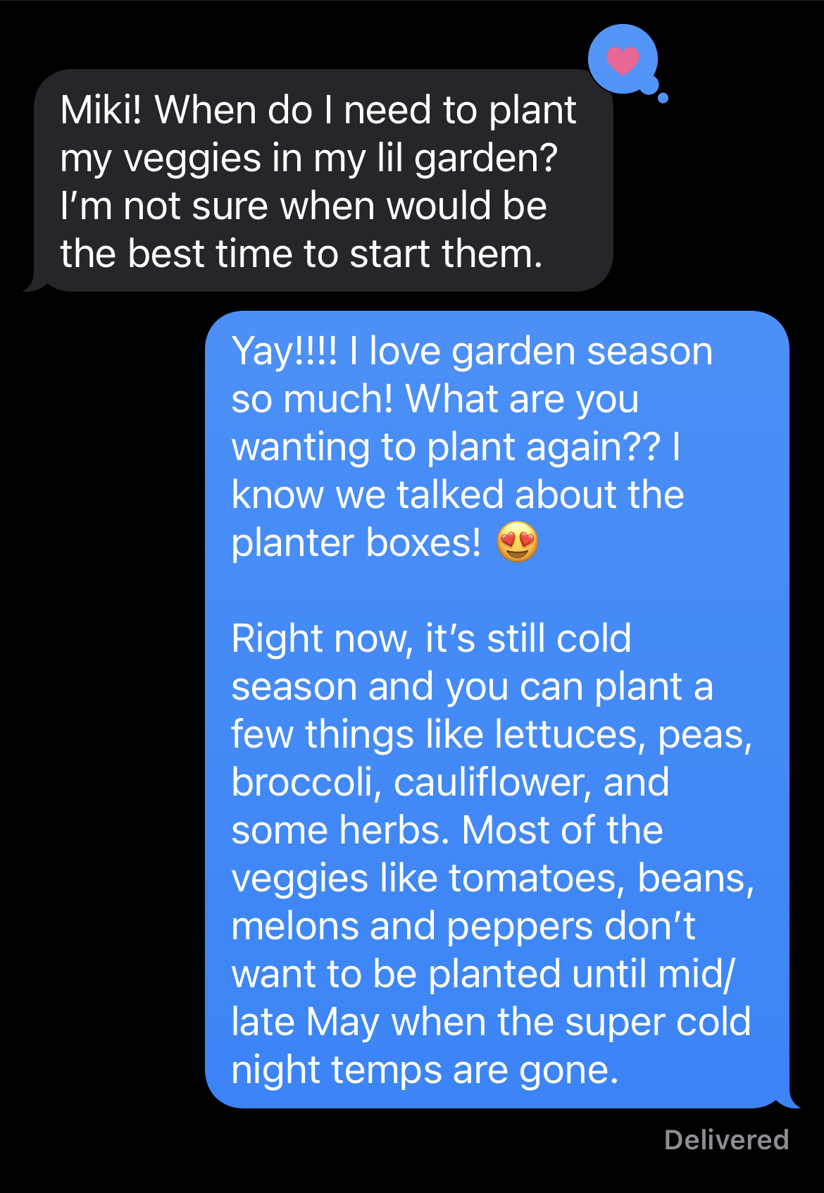 Me: I will help you refine the plants for your garden and create a garden map for you to print out and use throughout the season. The map will also include planting dates, companion planting (making sure the plants that are next to each other like each other and don’t cause drama), as well as a feeding and watering schedule that will take into account our drought conditions.